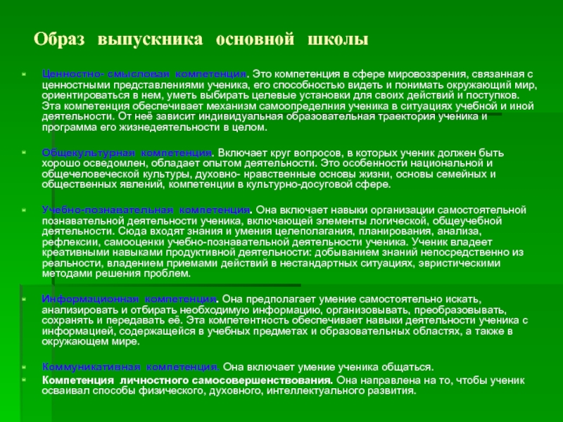 связанная с ценностными представлениями ученика, его способностью видеть и понимать окружающий мир, ориентироваться в нем, уметь выбирать целевые установки для своих действий и поступков. Эта компетенция обеспечивает механизм самоопределния ученика в ситуациях учебной и иной деятельности. От неё зависит индивидуальная образовательная траектория ученика и программа его жизнедеятельности в целом.