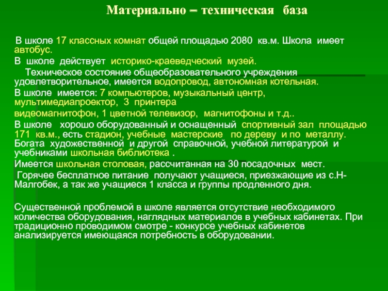 - наличие компьютерного класса; - недостаточно налажена - горячее питание; работа с родителями