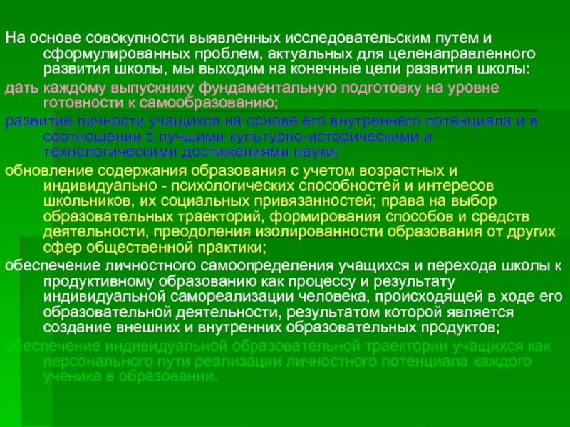 развитие личности учащихся на основе его внутреннего потенциала и в соотношении с лучшими культурно-историческими и технологическими достижениями науки;