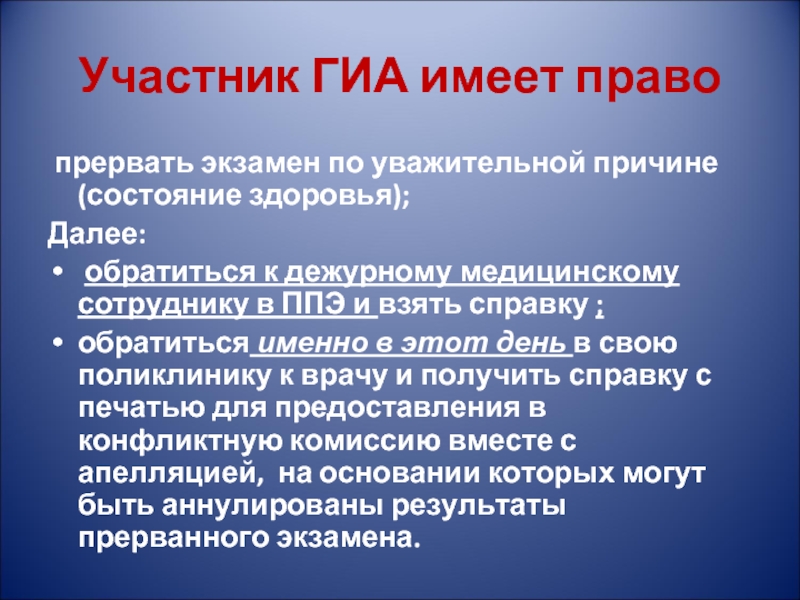 обратиться именно в этот день в свою поликлинику к врачу и получить справку с печатью для предоставления в конфликтную комиссию вместе с апелляцией, на основании которых могут быть аннулированы результаты прерванного экзамена.