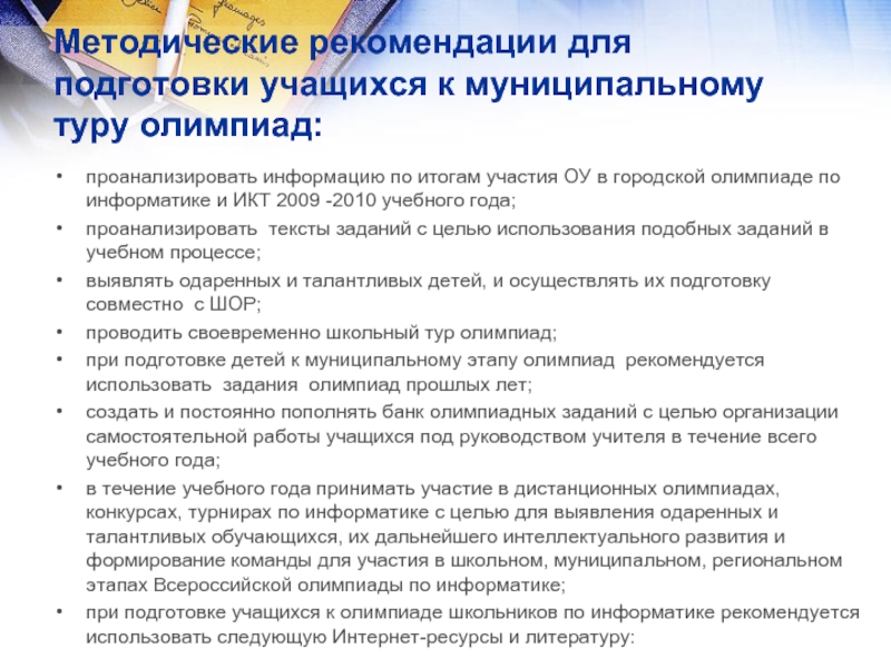 Слайд 11Методические рекомендации для подготовки учащихся к муниципальному туру олимпиад: