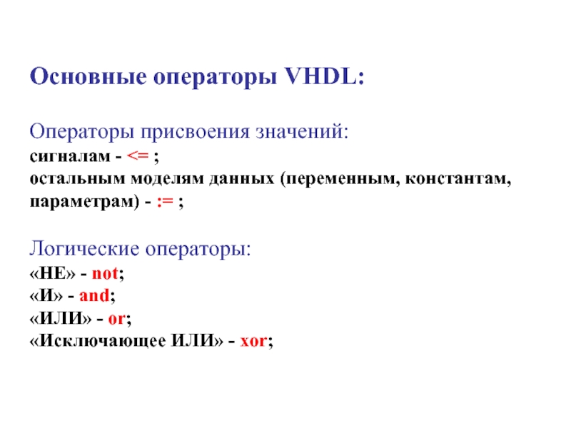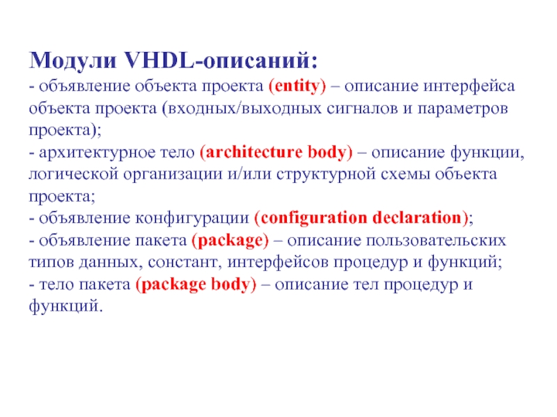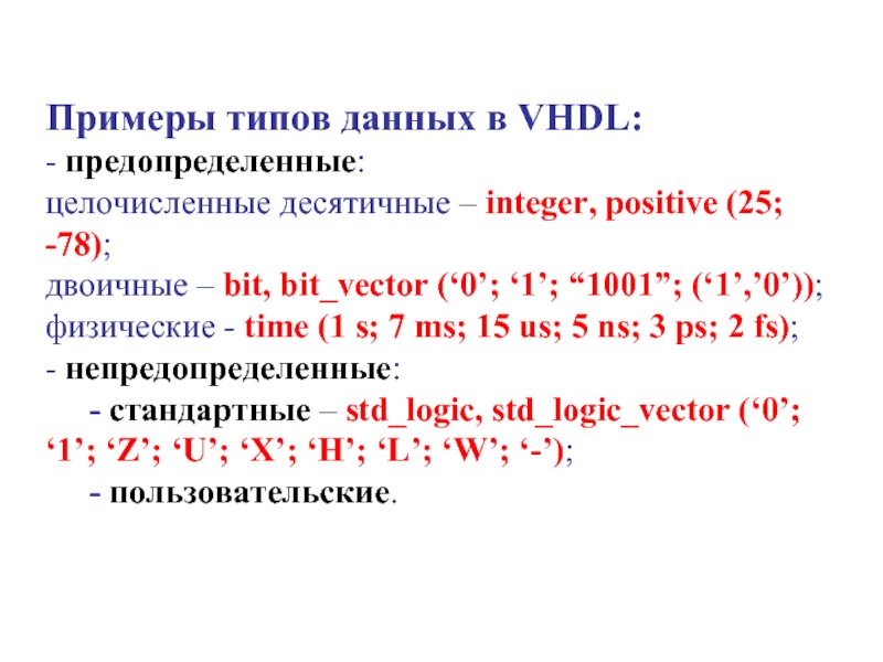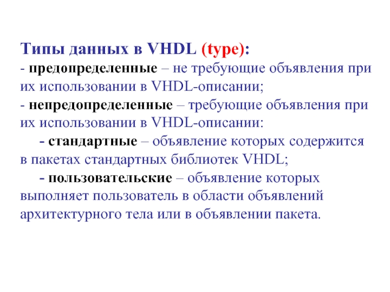 - непредопределенные – требующие объявления при их использовании в VHDL-описании: