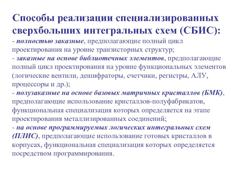 Слайд 4Способы реализации специализированных сверхбольших интегральных схем (СБИС):