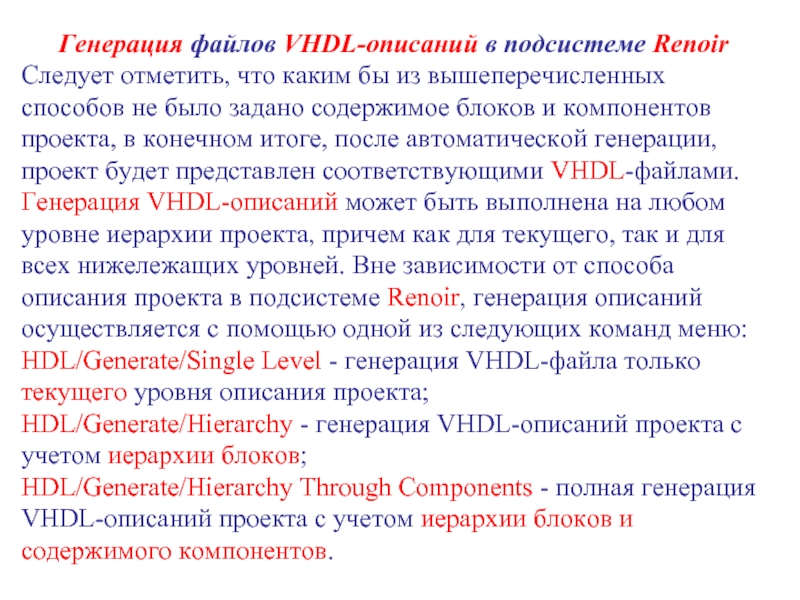 Генерация VHDL-описаний может быть выполнена на любом уровне иерархии проекта, причем как для текущего, так и для всех нижележащих уровней. Вне зависимости от способа описания проекта в подсистеме Renoir, генерация описаний осуществляется с помощью одной из следующих команд меню: