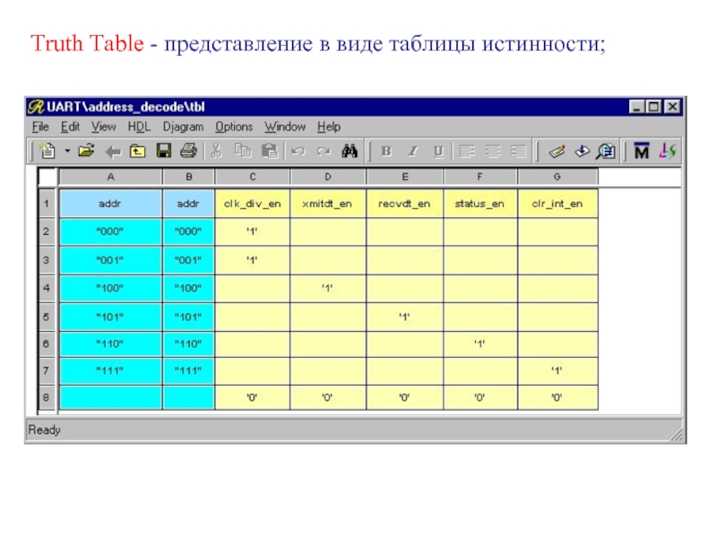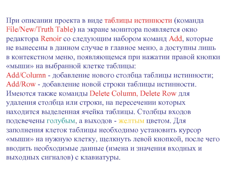 Имеются также команды Delete Column, Delete Row для удаления столбца или строки, на пересечении которых находится выделенная ячейка таблицы. Столбцы входов подсвечены голубым, а выходов - желтым цветом. Для заполнения клеток таблицы необходимо установить курсор «мыши» на нужную клетку, щелкнуть левой кнопкой, после чего вводить необходимые данные (имена и значения входных и выходных сигналов) с клавиатуры.