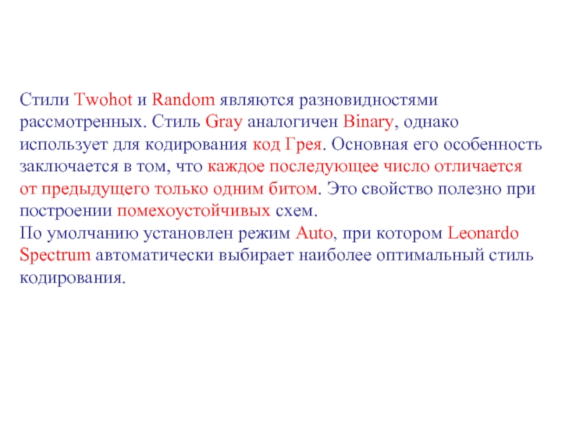 По умолчанию установлен режим Auto, при котором Leonardo Spectrum автоматически выбирает наиболее оптимальный стиль кодирования.