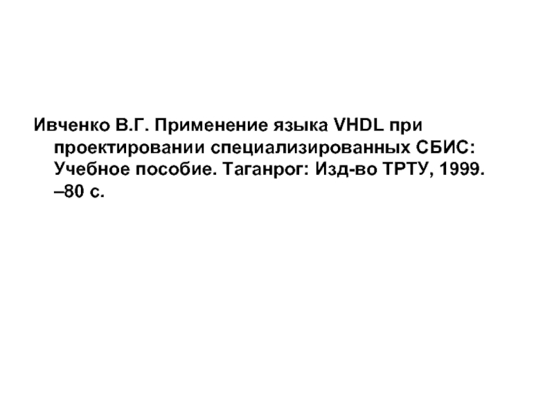 Слайд 2Ивченко В.Г. Применение языка VHDL при проектировании специализированных СБИС: Учебное пособие.