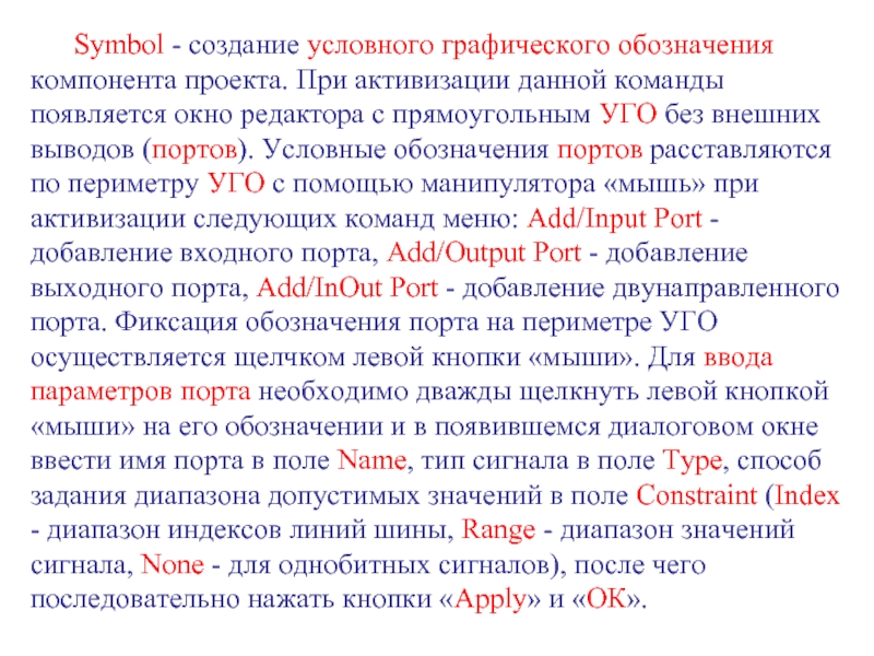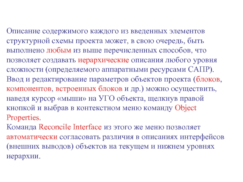 Команда Reconcile Interface из этого же меню позволяет автоматически согласовать различия в описаниях интерфейсов (внешних выводов) объектов на текущем и нижнем уровнях иерархии.