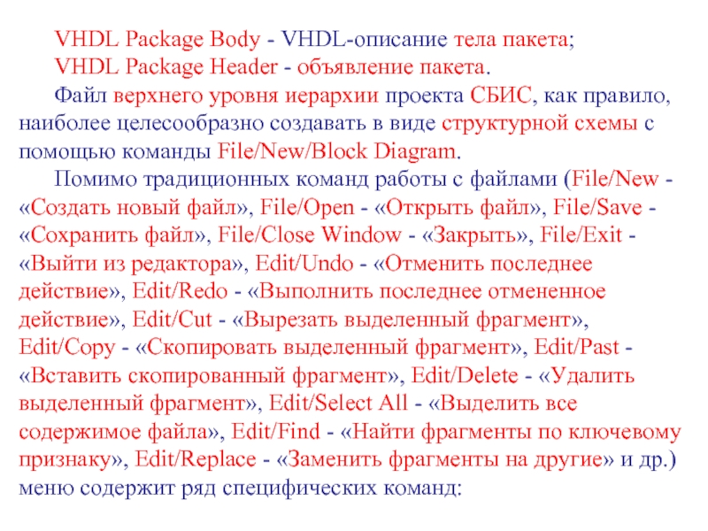 Компиляция VHDL-описаний осуществляется с помощью следующих команд: