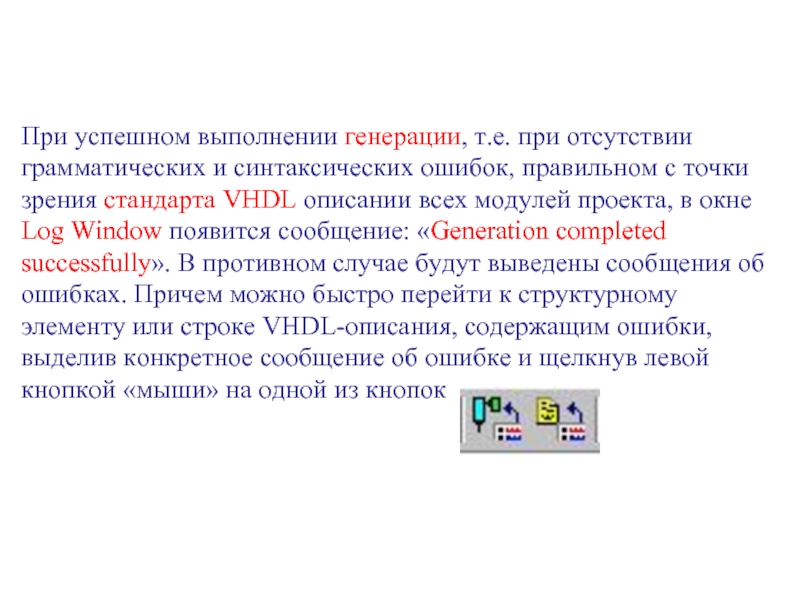 правильном с точки зрения стандарта VHDL описании всех модулей проекта, в окне Log Window появится сообщение: «Generation completed successfully». В противном случае будут выведены сообщения об ошибках. Причем можно быстро перейти к структурному элементу или строке VHDL-описания, содержащим ошибки, выделив конкретное сообщение об ошибке и щелкнув левой кнопкой «мыши» на одной из кнопок