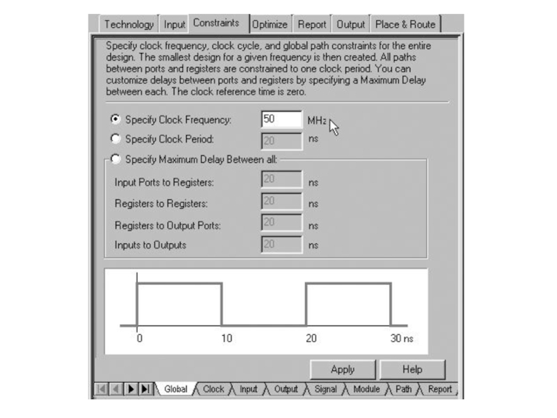 В поле Specify Clock Frequency задается требование к частоте тактового сигнала. В случае, если необходимо задать период сигнала, нужное значение заносится в поле Specify Clock Period.