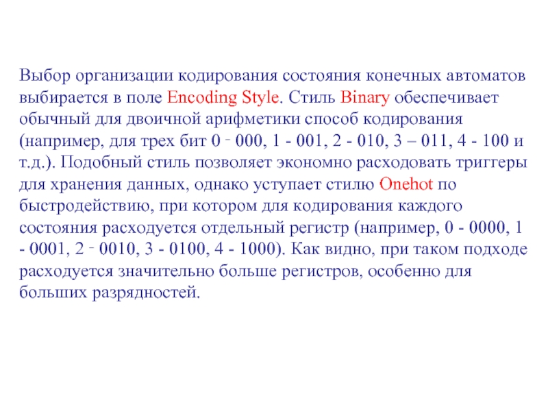 Стиль Binary обеспечивает обычный для двоичной арифметики способ кодирования (например, для трех бит 0 ‑ 000, 1 - 001, 2 - 010, 3 – 011, 4 - 100 и т.д.). Подобный стиль позволяет экономно расходовать триггеры для хранения данных, однако уступает стилю Onehot по быстродействию, при котором для кодирования каждого состояния расходуется отдельный регистр (например, 0 - 0000, 1 - 0001, 2 ‑ 0010, 3 - 0100, 4 - 1000). Как видно, при таком подходе расходуется значительно больше регистров, особенно для больших разрядностей.
