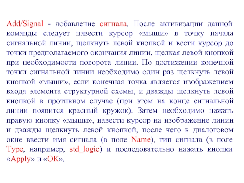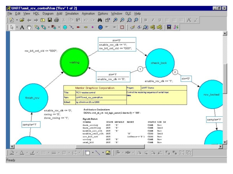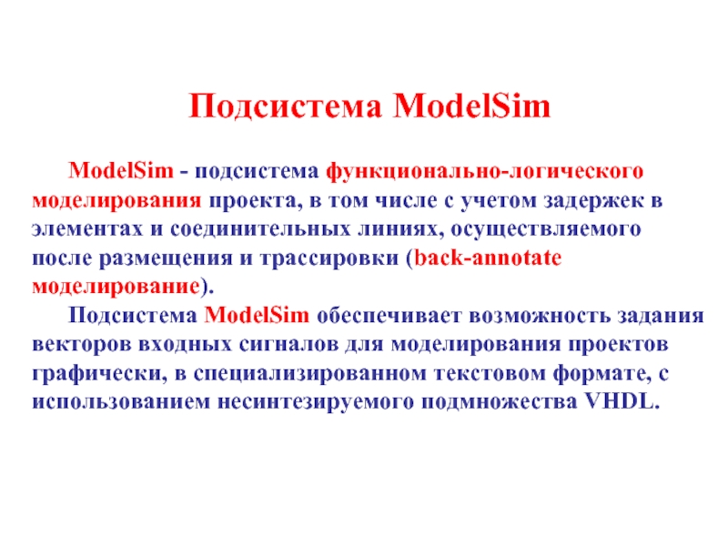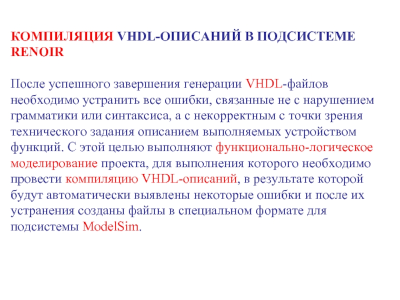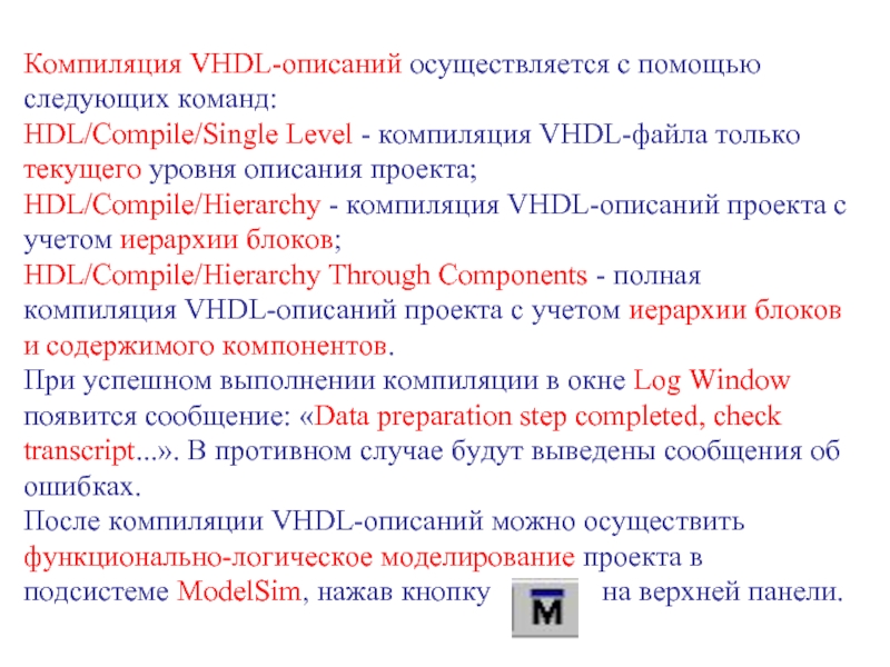все ошибки, связанные не с нарушением грамматики или синтаксиса, а с некорректным с точки зрения технического задания описанием выполняемых устройством функций. С этой целью выполняют функционально-логическое моделирование проекта, для выполнения которого необходимо провести компиляцию VHDL-описаний, в результате которой будут автоматически выявлены некоторые ошибки и после их устранения созданы файлы в специальном формате для подсистемы ModelSim.