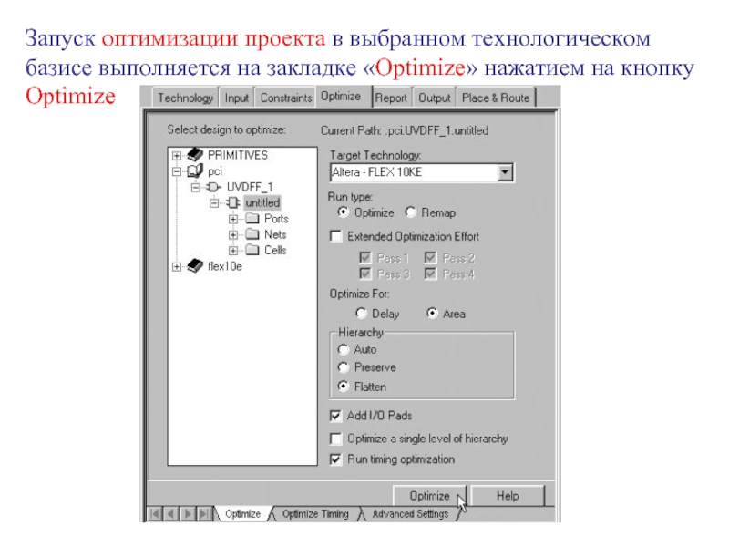 Запуск оптимизации проекта в выбранном технологическом базисе выполняется на закладке «Optimize»