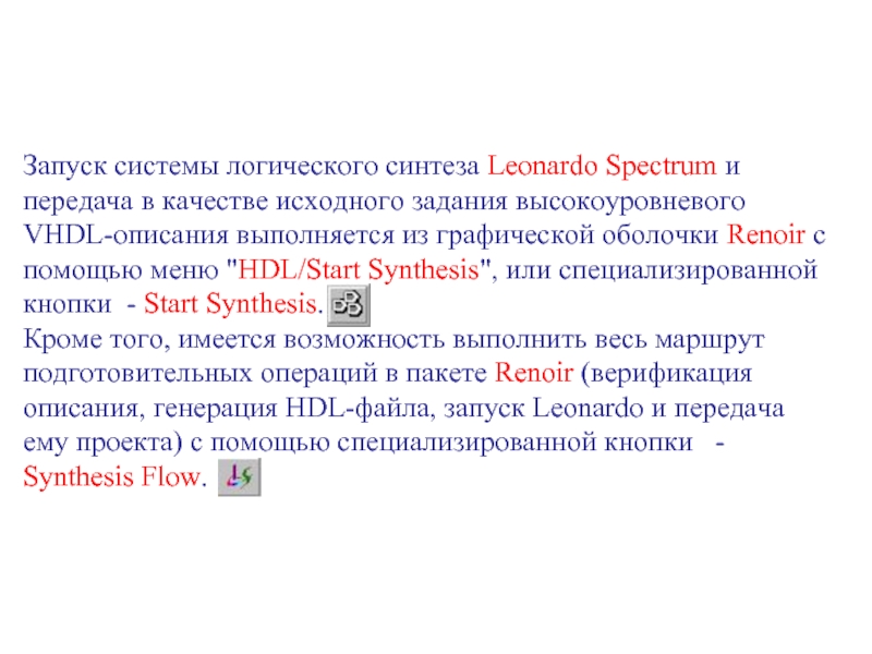 Кроме того, имеется возможность выполнить весь маршрут подготовительных операций в пакете Renoir (верификация описания, генерация HDL-файла, запуск Leonardo и передача ему проекта) с помощью специализированной кнопки - Synthesis Flow.