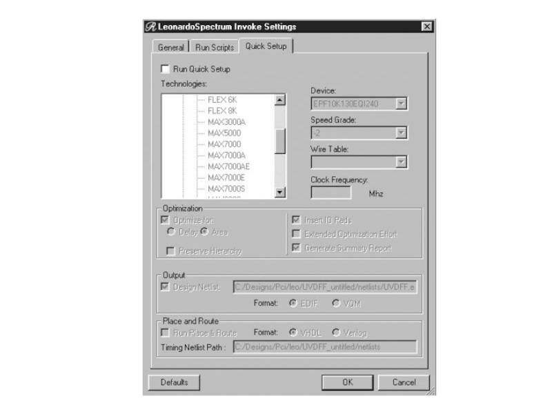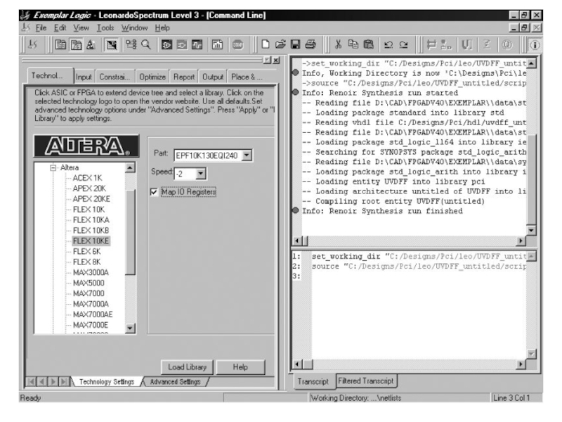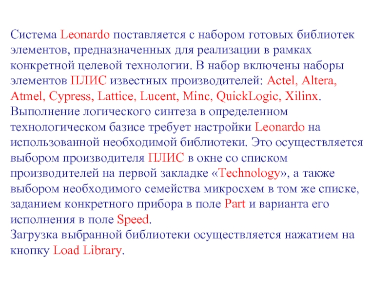 Выполнение логического синтеза в определенном технологическом базисе требует настройки Leonardo на использованной необходимой библиотеки. Это осуществляется выбором производителя ПЛИС в окне со списком производителей на первой закладке «Technology», а также выбором необходимого семейства микросхем в том же списке, заданием конкретного прибора в поле Part и варианта его исполнения в поле Speed.