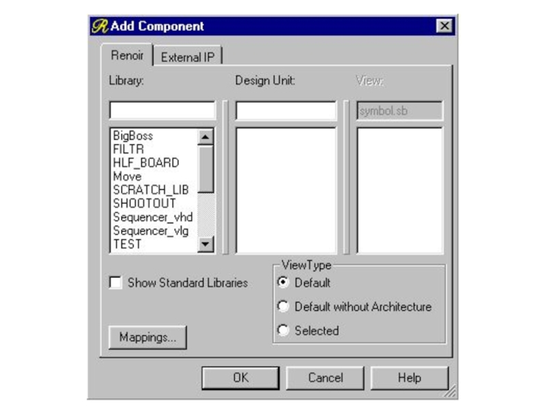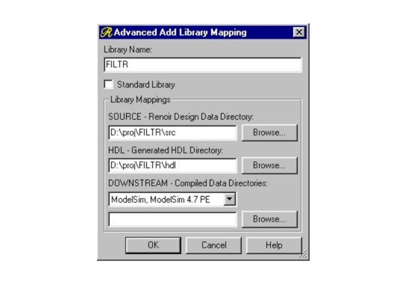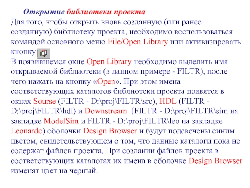 - библиотеки ресурсов – совокупность файлов VHDL-описаний, находящихся вне каталога проекта, на которые имеются ссылки в данном проекте.