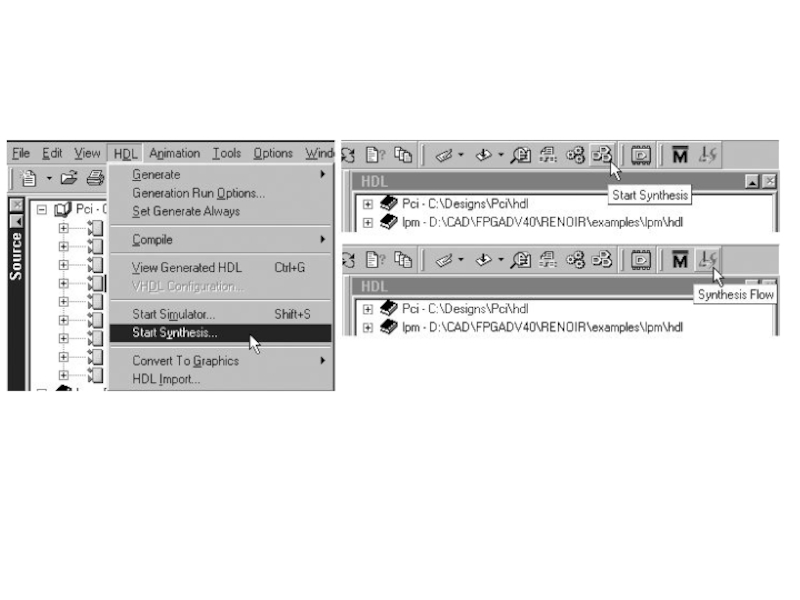 задания высокоуровневого VHDL-описания выполняется из графической оболочки Renoir с помощью меню "HDL/Start Synthesis", или специализированной кнопки - Start Synthesis.
