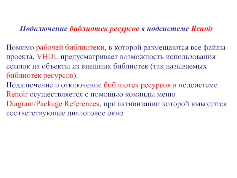 все файлы проекта, VHDL предусматривает возможность использования ссылок на объекты из внешних библиотек (так называемых библиотек ресурсов).