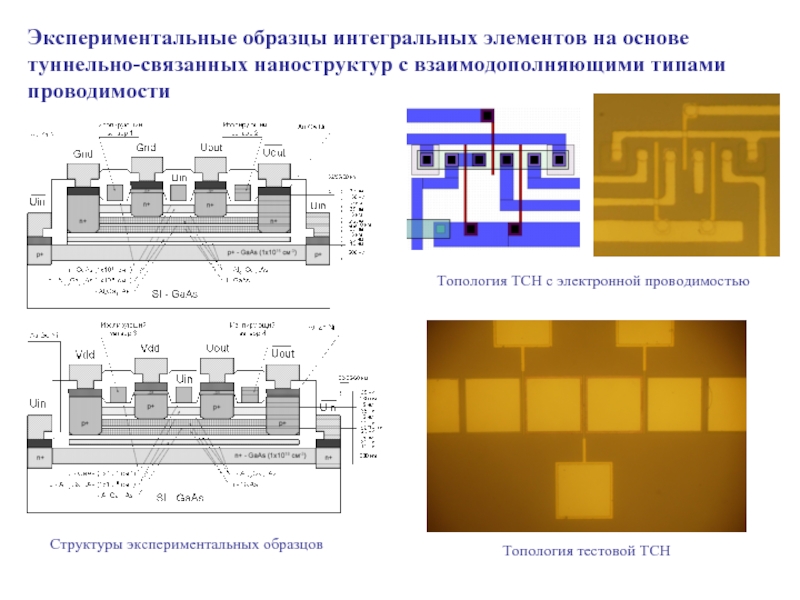 Слайд 9Экспериментальные образцы интегральных элементов на основе туннельно-связанных наноструктур с взаимодополняющими типами