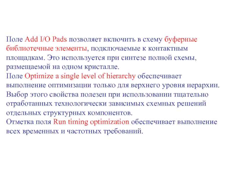 Поле Optimize a single level of hierarchy обеспечивает выполнение оптимизации только для верхнего уровня иерархии. Выбор этого свойства полезен при использовании тщательно отработанных технологически зависимых схемных решений отдельных структурных компонентов.