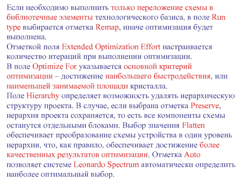 Поле Hierarchy определяет возможность удалять иерархическую структуру проекта. В случае, если выбрана отметка Preserve, иерархия проекта сохраняется, то есть все компоненты схемы останутся отдельными блоками. Выбор значения Flatten обеспечивает преобразование схемы устройства в один уровень иерархии, что, как правило, обеспечивает достижение более качественных результатов оптимизации. Отметка Auto позволяет системе Leonardo Spectrum автоматически определить наиболее оптимальный выбор.