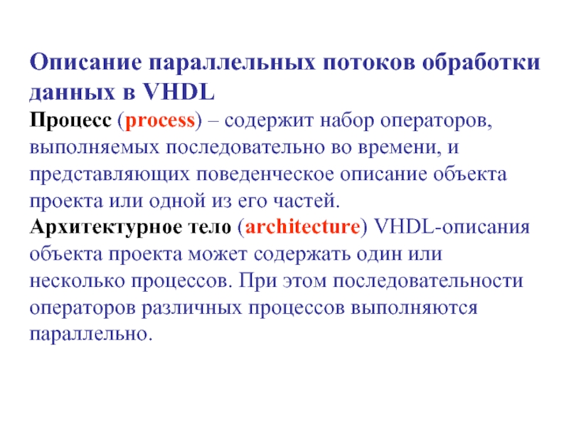 Архитектурное тело (architecture) VHDL-описания объекта проекта может содержать один или несколько процессов. При этом последовательности операторов различных процессов выполняются параллельно.