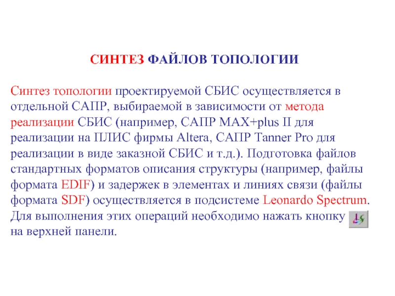 в зависимости от метода реализации СБИС (например, САПР MAX+plus II для реализации на ПЛИС фирмы Altera, САПР Tanner Pro для реализации в виде заказной СБИС и т.д.). Подготовка файлов стандартных форматов описания структуры (например, файлы формата EDIF) и задержек в элементах и линиях связи (файлы формата SDF) осуществляется в подсистеме Leonardo Spectrum. Для выполнения этих операций необходимо нажать кнопку