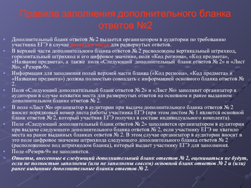 При недостатке места для ответов на основном бланке ответов № 2 участник ЕГЭ может продолжить записи на дополнительном бланке ответов № 2, выдаваемом организатором в аудитории по требованию участника в случае, когда на основном бланке ответов № 2 не осталось места. В случае заполнения дополнительного бланка ответов № 2 при незаполненном основном бланке ответов № 2, ответы, внесенные в дополнительный бланк ответов № 2, оцениваться не будут.
