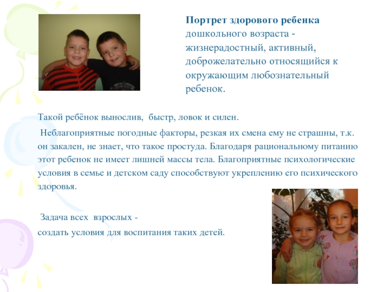 Неблагоприятные погодные факторы, резкая их смена ему не страшны, т.к. он закален, не знает, что такое простуда. Благодаря рациональному питанию этот ребенок не имеет лишней массы тела. Благоприятные психологические условия в семье и детском саду способствуют укреплению его психического здоровья.