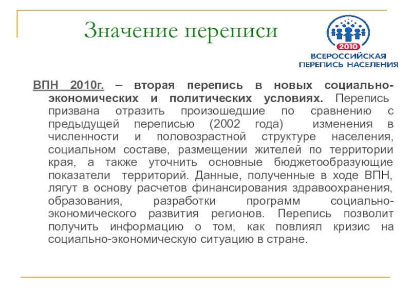 в новых социально-экономических и политических условиях. Перепись призвана отразить произошедшие по сравнению с предыдущей переписью (2002 года) изменения в численности и половозрастной структуре населения, социальном составе, размещении жителей по территории края, а также уточнить основные бюджетообразующие показатели территорий. Данные, полученные в ходе ВПН, лягут в основу расчетов финансирования здравоохранения, образования, разработки программ социально-экономического развития регионов. Перепись позволит получить информацию о том, как повлиял кризис на социально-экономическую ситуацию в стране.