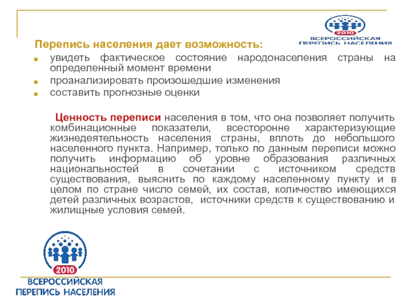Ценность переписи населения в том, что она позволяет получить комбинационные показатели, всесторонне характеризующие жизнедеятельность населения страны, вплоть до небольшого населенного пункта. Например, только по данным переписи можно получить информацию об уровне образования различных национальностей в сочетании с источником средств существования, выяснить по каждому населенному пункту и в целом по стране число семей, их состав, количество имеющихся детей различных возрастов, источники средств к существованию и жилищные условия семей.