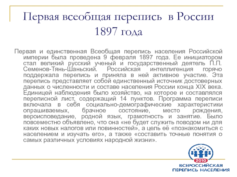 населения Российской империи была проведена 9 февраля 1897 года. Ее инициатором стал великий русский ученый и государственный деятель П.П.Семенов-Тянь-Шаньский. Российская интеллигенция горячо поддержала перепись и приняла в ней активное участие. Эта перепись представляет собой единственный источник достоверных данных о численности и составе населения России конца XIX века. Единицей наблюдения было хозяйство, на которое и составлялся переписной лист, содержащий 14 пунктов. Программа переписи включала в себя социально-демографические характеристики опрашиваемых, брачное состояние, место рождения, вероисповедание, родной язык, грамотность и занятие. Было повсеместно объявлено, что она «не будет служить поводом ни для каких новых налогов или повинностей», а цель её «познакомиться с населением и изучать его», а также «составить точные понятия о самых различных условиях народной жизни».