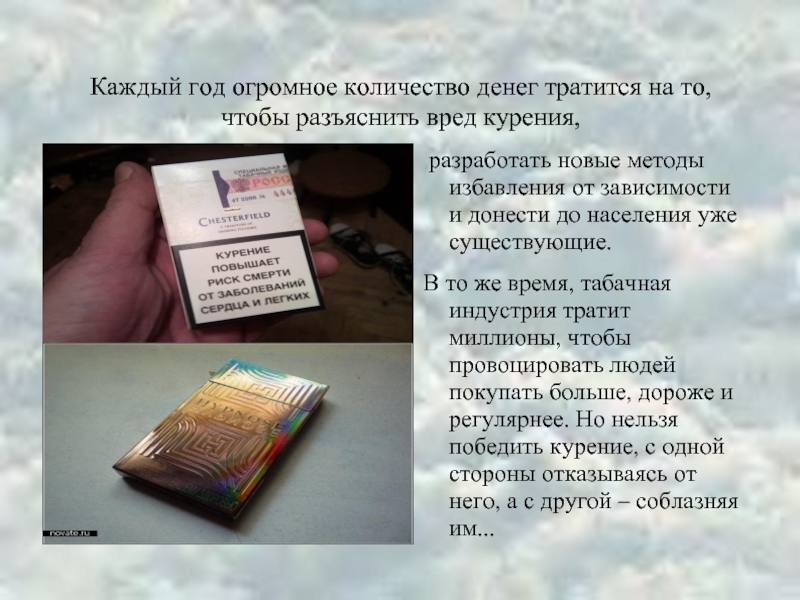 В то же время, табачная индустрия тратит миллионы, чтобы провоцировать людей покупать больше, дороже и регулярнее. Но нельзя победить курение, с одной стороны отказываясь от него, а с другой – соблазняя им...