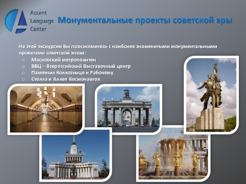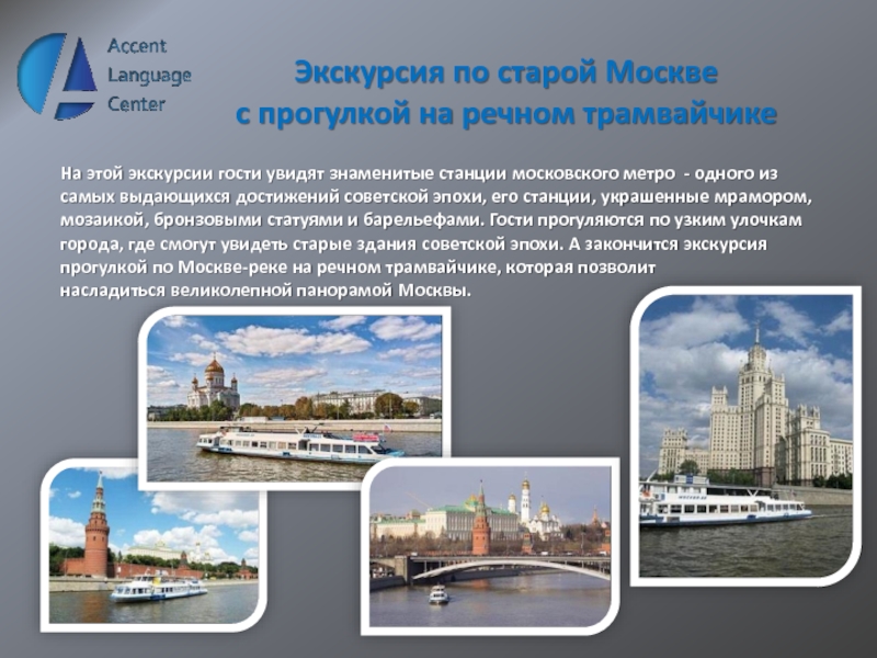 - одного из самых выдающихся достижений советской эпохи, его станции, украшенные мрамором, мозаикой, бронзовыми статуями и барельефами. Гости прогуляются по узким улочкам города, где смогут увидеть старые здания советской эпохи. А закончится экскурсия прогулкой по Москве-реке на речном трамвайчике, которая позволит насладиться великолепной панорамой Москвы.