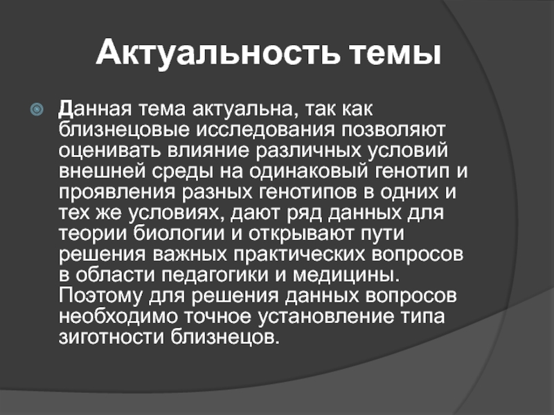 близнецовые исследования позволяют оценивать влияние различных условий внешней среды на одинаковый генотип и проявления разных генотипов в одних и тех же условиях, дают ряд данных для теории биологии и открывают пути решения важных практических вопросов в области педагогики и медицины. Поэтому для решения данных вопросов необходимо точное установление типа зиготности близнецов.