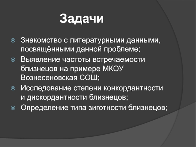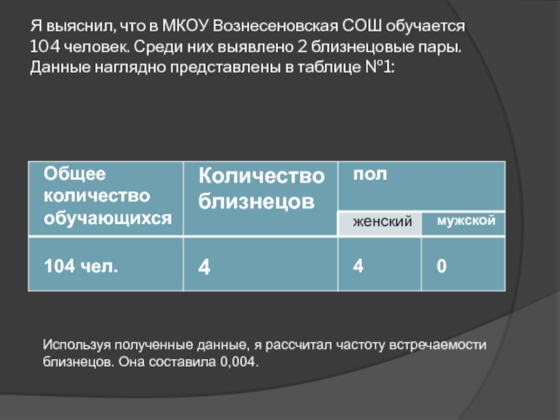 Выявление частоты встречаемости близнецов на примере МКОУ Вознесеновская СОШ;