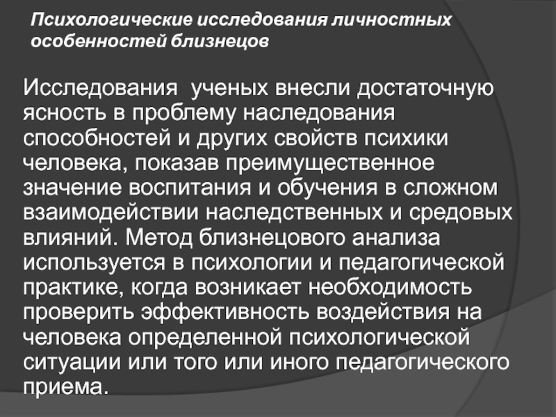 проблему наследования способностей и других свойств психики человека, показав преимущественное значение воспитания и обучения в сложном взаимодействии наследственных и средовых влияний. Метод близнецового анализа используется в психологии и педагогической практике, когда возникает необходимость проверить эффективность воздействия на человека определенной психологической ситуации или того или иного педагогического приема.