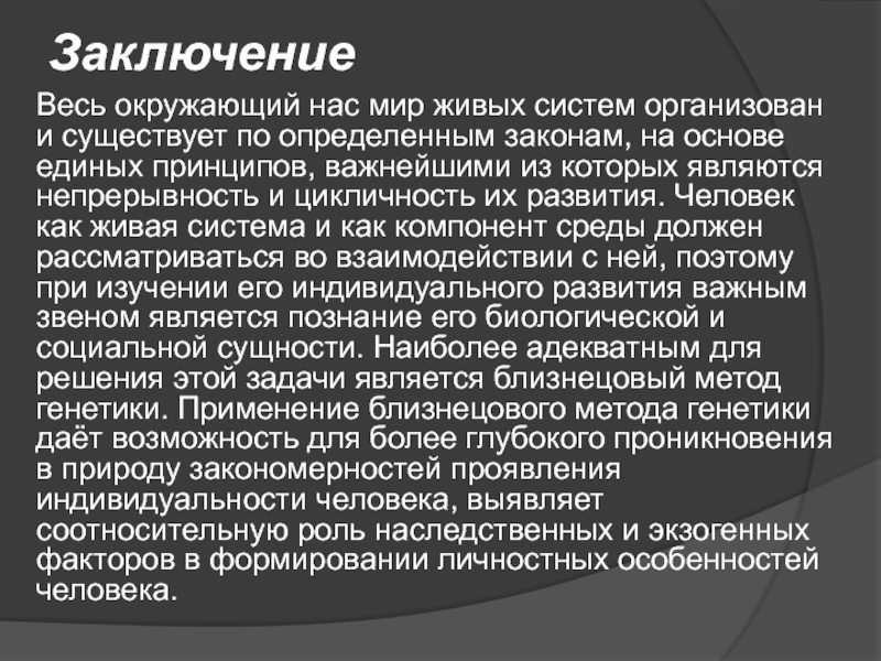 законам, на основе единых принципов, важнейшими из которых являются непрерывность и цикличность их развития. Человек как живая система и как компонент среды должен рассматриваться во взаимодействии с ней, поэтому при изучении его индивидуального развития важным звеном является познание его биологической и социальной сущности. Наиболее адекватным для решения этой задачи является близнецовый метод генетики. Применение близнецового метода генетики даёт возможность для более глубокого проникновения в природу закономерностей проявления индивидуальности человека, выявляет соотносительную роль наследственных и экзогенных факторов в формировании личностных особенностей человека.