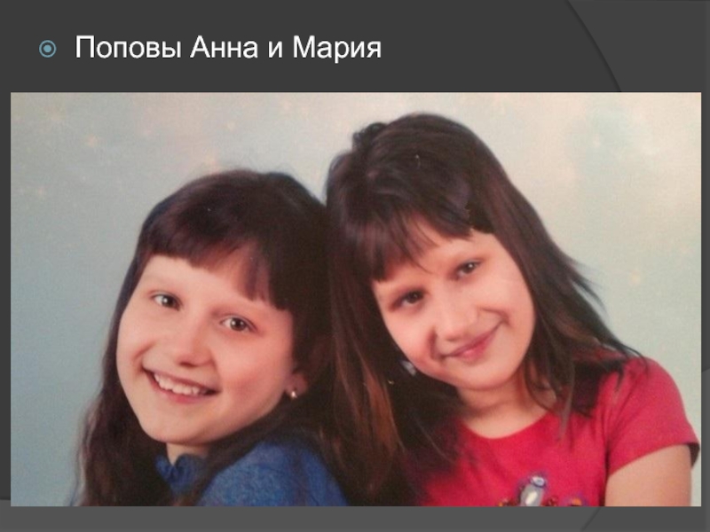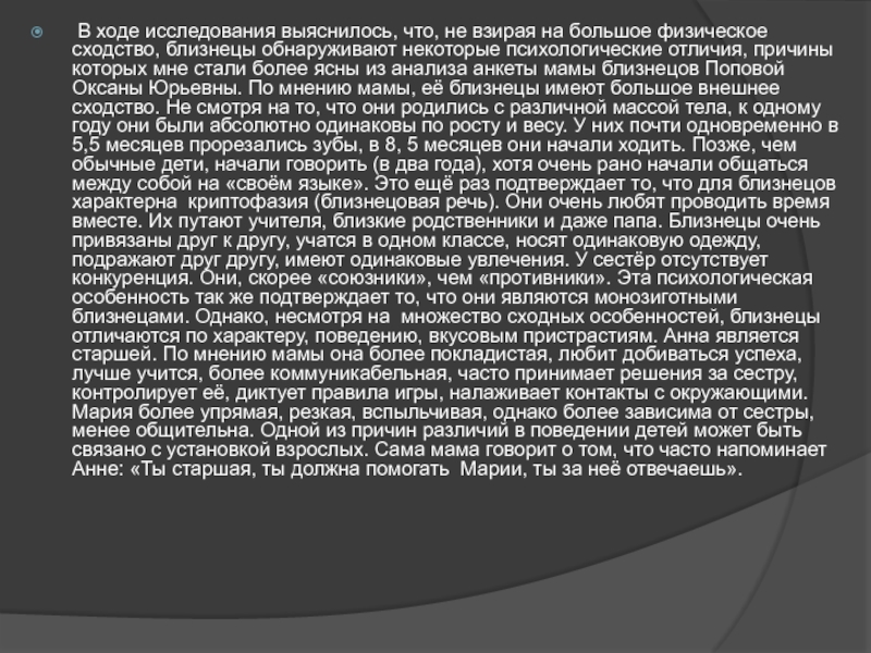 сходство, близнецы обнаруживают некоторые психологические отличия, причины которых мне стали более ясны из анализа анкеты мамы близнецов Поповой Оксаны Юрьевны. По мнению мамы, её близнецы имеют большое внешнее сходство. Не смотря на то, что они родились с различной массой тела, к одному году они были абсолютно одинаковы по росту и весу. У них почти одновременно в 5,5 месяцев прорезались зубы, в 8, 5 месяцев они начали ходить. Позже, чем обычные дети, начали говорить (в два года), хотя очень рано начали общаться между собой на «своём языке». Это ещё раз подтверждает то, что для близнецов характерна криптофазия (близнецовая речь). Они очень любят проводить время вместе. Их путают учителя, близкие родственники и даже папа. Близнецы очень привязаны друг к другу, учатся в одном классе, носят одинаковую одежду, подражают друг другу, имеют одинаковые увлечения. У сестёр отсутствует конкуренция. Они, скорее «союзники», чем «противники». Эта психологическая особенность так же подтверждает то, что они являются монозиготными близнецами. Однако, несмотря на множество сходных особенностей, близнецы отличаются по характеру, поведению, вкусовым пристрастиям. Анна является старшей. По мнению мамы она более покладистая, любит добиваться успеха, лучше учится, более коммуникабельная, часто принимает решения за сестру, контролирует её, диктует правила игры, налаживает контакты с окружающими. Мария более упрямая, резкая, вспыльчивая, однако более зависима от сестры, менее общительна. Одной из причин различий в поведении детей может быть связано с установкой взрослых. Сама мама говорит о том, что часто напоминает Анне: «Ты старшая, ты должна помогать Марии, ты за неё отвечаешь».