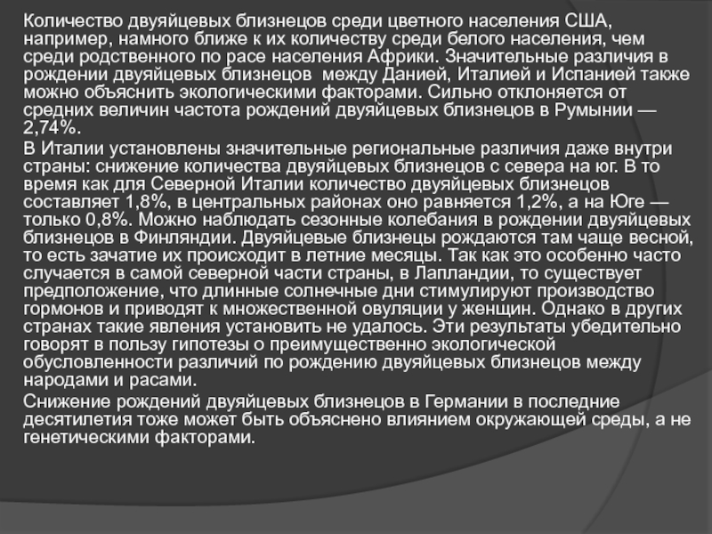 их количеству среди белого населения, чем среди родственного по расе населения Африки. Значительные различия в рождении двуяйцевых близнецов между Данией, Италией и Испанией также можно объяснить экологическими факторами. Сильно отклоняется от средних величин частота рождений двуяйцевых близнецов в Румынии — 2,74%.