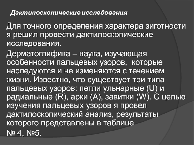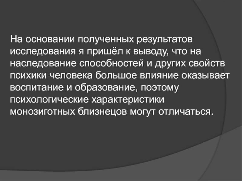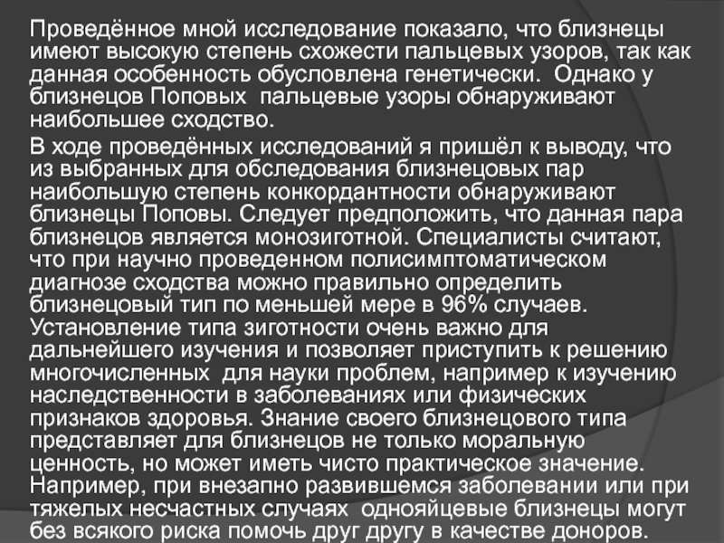 Слайд 29Проведённое мной исследование показало, что близнецы имеют высокую степень схожести пальцевых