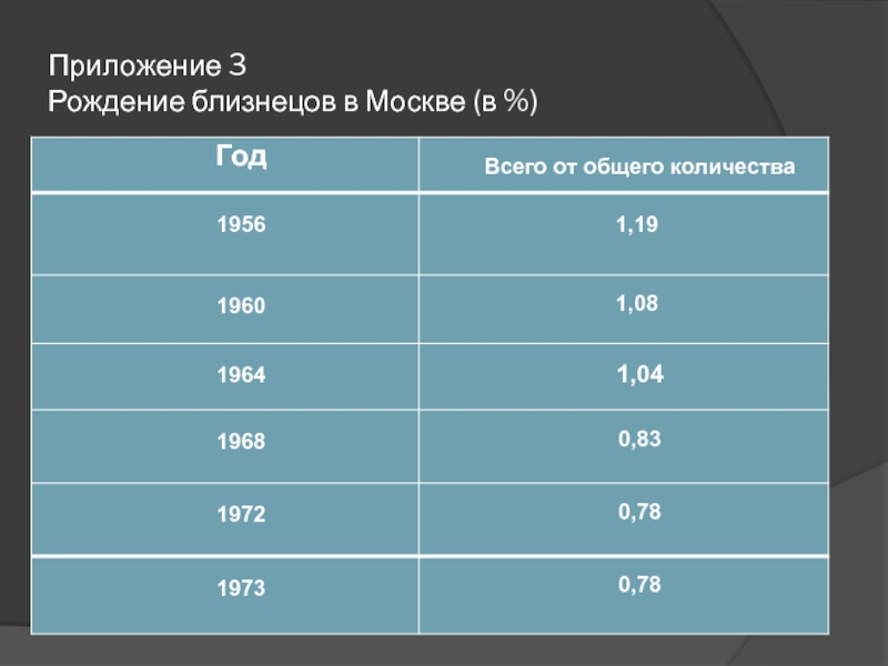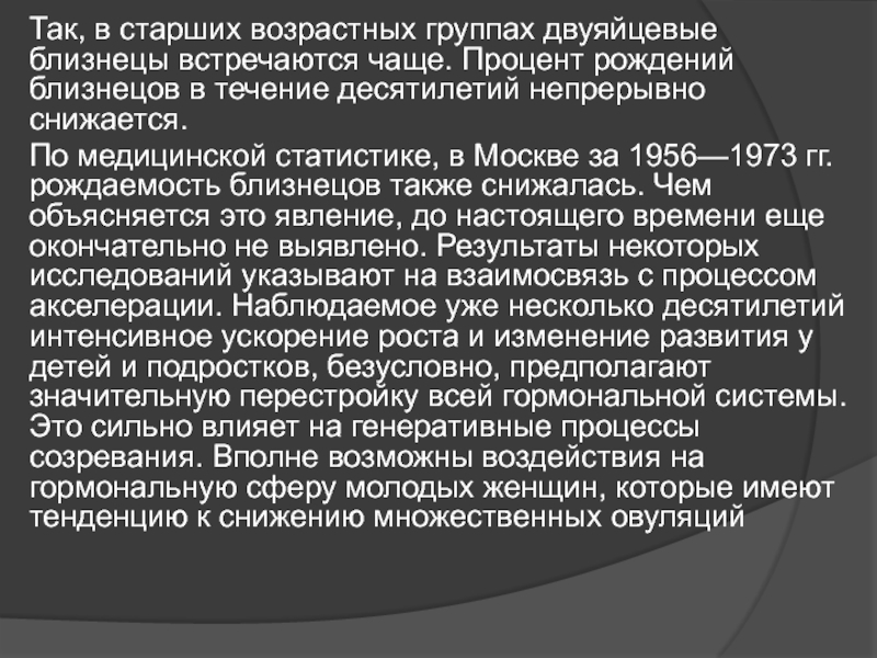 По медицинской статистике, в Москве за 1956—1973 гг. рождаемость близнецов также снижалась. Чем объясняется это явление, до настоящего времени еще окончательно не выявлено. Результаты некоторых исследований указывают на взаимосвязь с процессом акселерации. Наблюдаемое уже несколько десятилетий интенсивное ускорение роста и изменение развития у детей и подростков, безусловно, предполагают значительную перестройку всей гормональной системы. Это сильно влияет на генеративные процессы созревания. Вполне возможны воздействия на гормональную сферу молодых женщин, которые имеют тенденцию к снижению множественных овуляций