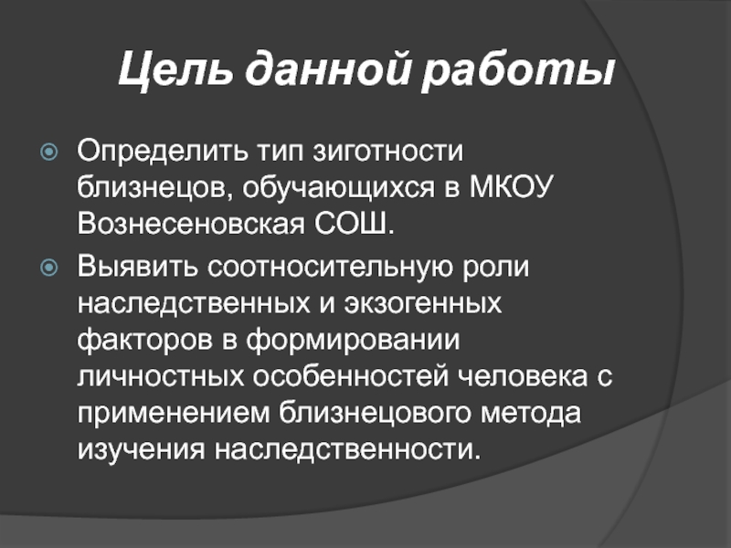 Выявить соотносительную роли наследственных и экзогенных факторов в формировании личностных особенностей человека с применением близнецового метода изучения наследственности.