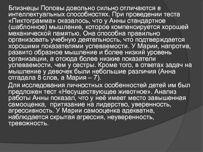 Слайд 32Близнецы Поповы довольно сильно отличаются в интеллектуальных способностях. При проведении теста