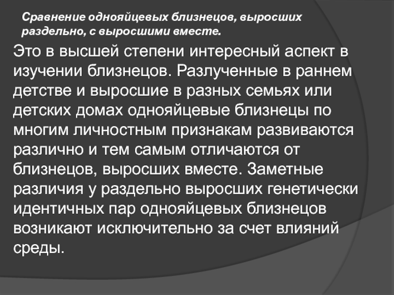 Слайд 18Сравнение однояйцевых близнецов, выросших раздельно, с выросшими вместе.