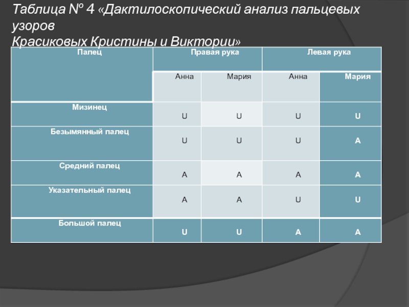 Слайд 27Таблица № 4 «Дактилоскопический анализ пальцевых узоров