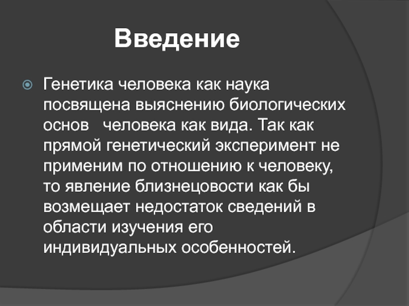как наука посвящена выяснению биологических основ человека как вида. Так как прямой генетический эксперимент не применим по отношению к человеку, то явление близнецовости как бы возмещает недостаток сведений в области изучения его индивидуальных особенностей.