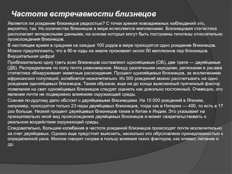 наблюдений это, вероятно, так. Но количество близнецов в мире исчисляется миллионами. Близнецовая статистика располагает интересными данными, на основе которых могут быть построены гипотезы относительно происхождения близнецов.