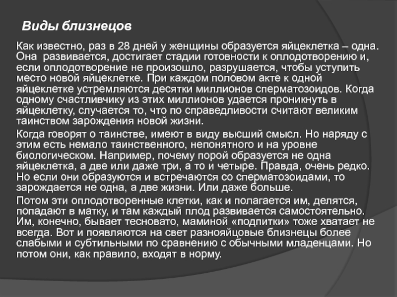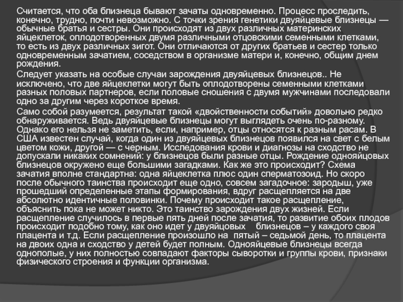 Слайд 10Считается, что оба близнеца бывают зачаты одновременно. Процесс проследить, конечно, трудно,